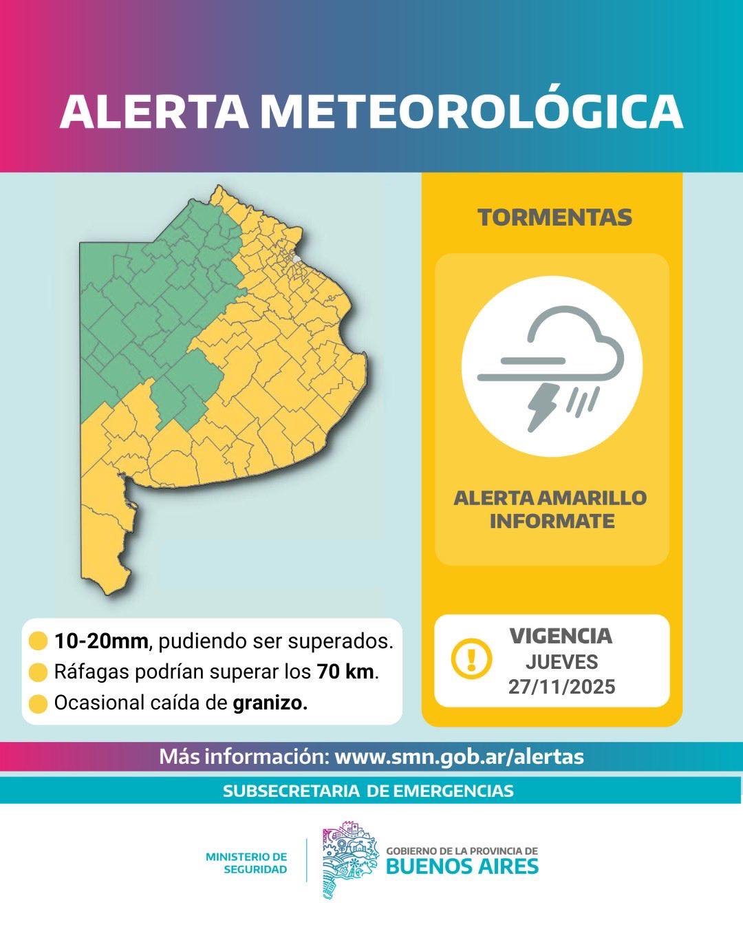 La región que comprende Ayacucho, Balcarce, General Guido, Maipú, el noroeste de General Juan Madariaga, el noroeste de Mar Chiquita y el oeste de General Pueyrredón se encuentra bajo alerta amarilla por tormentas, según el Pronóstico Oficial de Alertas y Advertencias emitido este jueves 27 de noviembre de 2025 a las 05:49 h. El informe advierte sobre la llegada de lluvias y tormentas de variada intensidad, algunas de carácter localmente fuerte.
