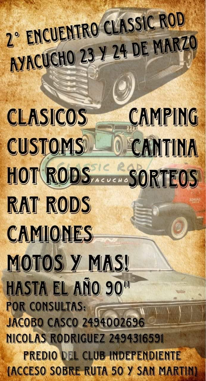 Este 23 y 24 de marzo, la ciudad de Ayacucho se convertirá en el epicentro del 2° Encuentro de Autos Clásicos “Classic Rod”, organizado por el Grupo Hinchas del Chevrolet. El evento, que promete revivir la época dorada del automovilismo, se llevará a cabo en el predio del Centro Recreativo Comunal del Club Independiente.