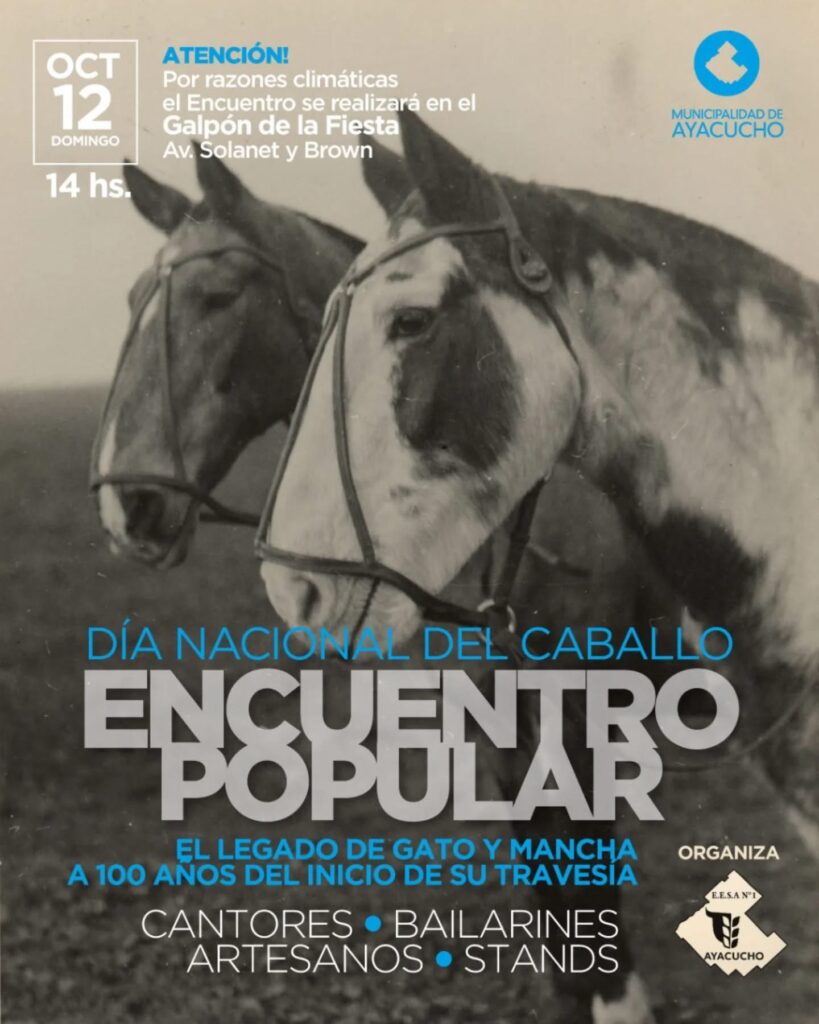 Este domingo 12 de octubre, desde las 14 horas, Ayacucho rendirá homenaje al legado de Gato y Mancha con una jornada de canto, danza y tradición criolla. Por razones climáticas, la actividad se trasladará al Galpón de la Fiesta, ubicado en avenida Solanet y Brown.