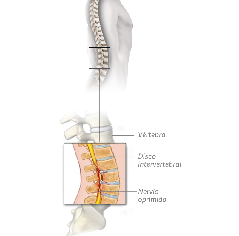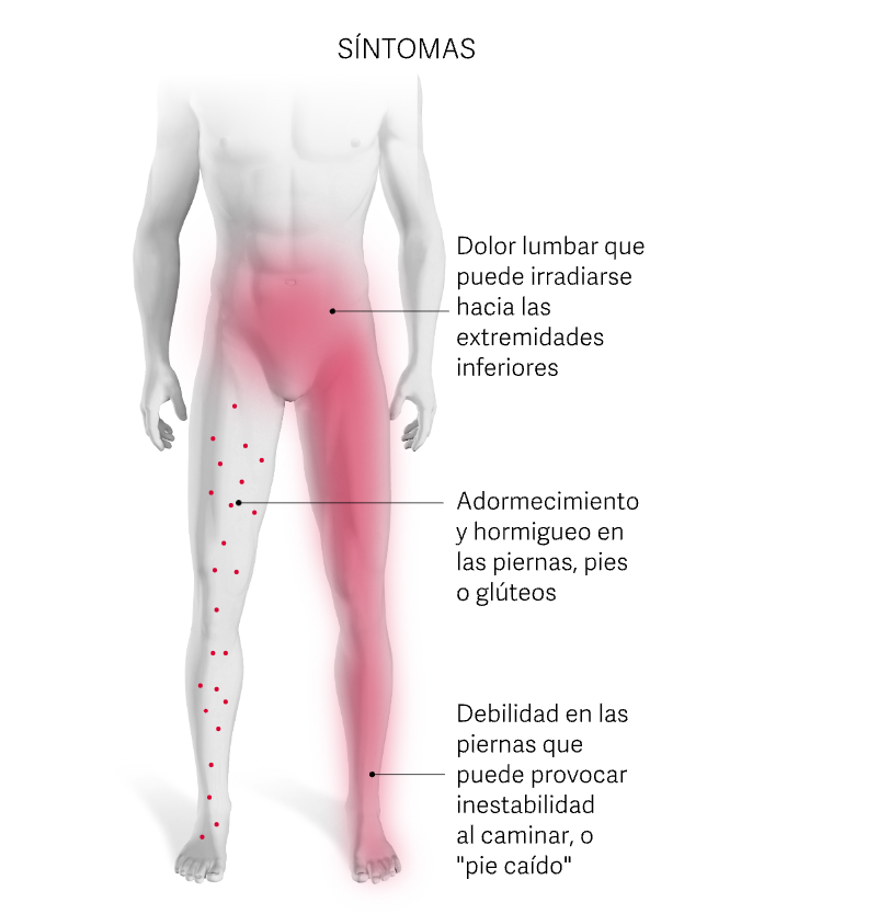 Se trata de un estrechamiento del canal en la parte baja de la columna, lo que puede comprimir los nervios y generar dolor lumbar, molestias en las piernas, hormigueo o debilidad.