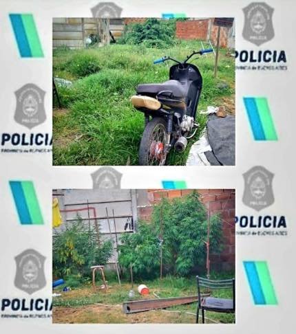 Durante una inspección del predio, el personal policial incautó tres plantas de cannabis sativa de aproximadamente 1,80 metros de altura, además de una motocicleta con numeración de motor suprimida.