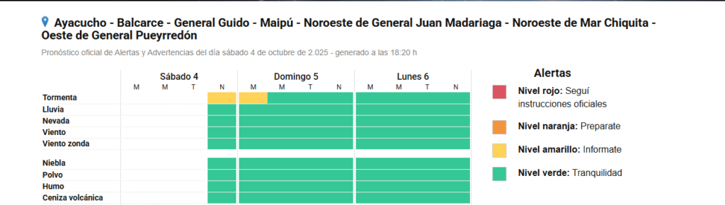 El Servicio Meteorológico Nacional emitió una alerta amarilla por tormentas fuertes que afectará durante la noche de este sábado 4 de octubre a Ayacucho, Balcarce, General Guido, Maipú, el noroeste de General Madariaga, el noroeste de Mar Chiquita y el oeste de General Pueyrredón.