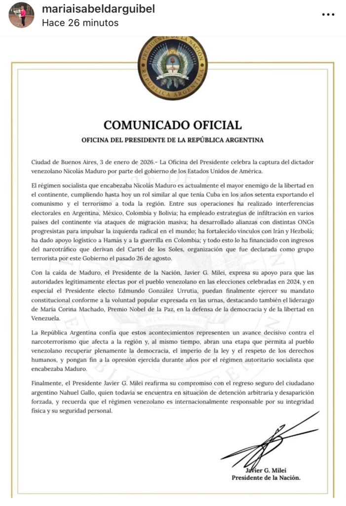 En el documento, el Ejecutivo argentino celebra la captura del “dictador venezolano”, al que define como “el mayor enemigo de la libertad en el continente”, acusándolo de exportar terrorismo, interferir en procesos electorales de distintos países y financiar sus operaciones a través del narcotráfico.