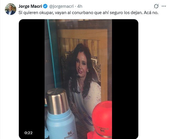 Durante el recorrido por el interior del inmueble se observan banderas y caños para sostenerlas, además de un cuadro de Juan Domingo Perón, tres veces presidente de la Nación. El video cierra con el anuncio oficial de las autoridades porteñas que informan que “la propiedad ya fue recuperada y totalmente liberada”.