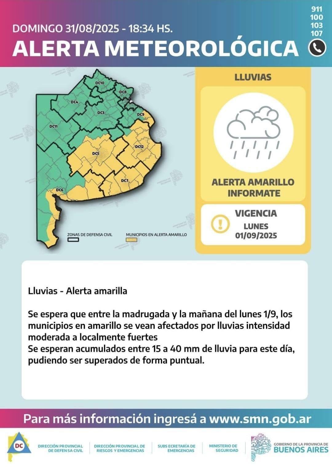 El Servicio Meteorológico Nacional (SMN) informó que desde la noche del domingo 31 de agosto se registran precipitaciones y tormentas en gran parte de la provincia de Buenos Aires.