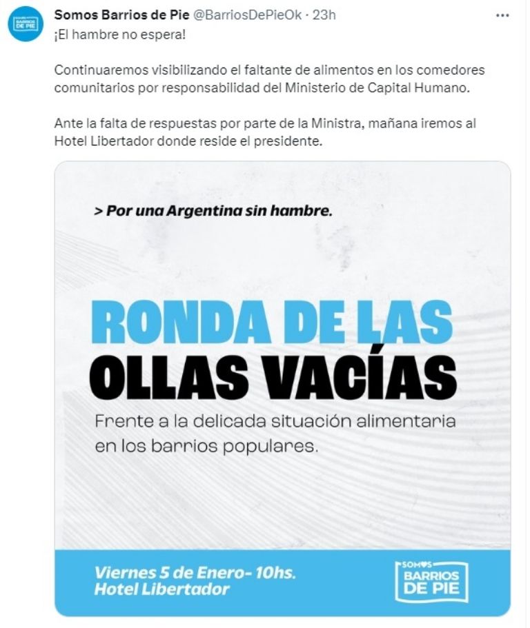 Somos Barrios de Pie se movilizará este viernes al Hotel Libertador, donde desde hace más de dos meses se hospeda el presidente Javier Milei, para denunciar que no se están “garantizando los alimentos para los comedores comunitarios”.