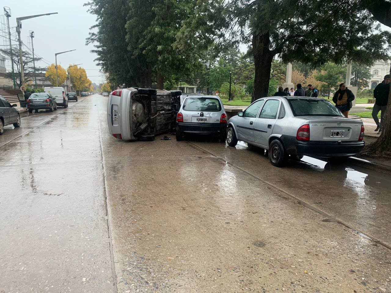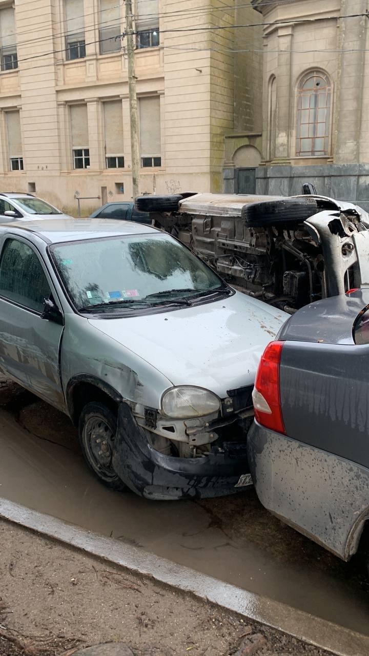 En un incidente ocurrido hoy cerca de las 15:00 horas, un vehículo de la marca Chevrolet perdió el control mientras circulaba por la calle Alem, entre San Martín y 25 de Mayo. En medio de una fuerte lluvia, el automóvil impactó contra dos vehículos estacionados y volcó, quedando en uno de sus laterales.