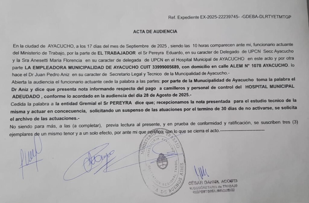 El gremio UPCN confirmó que, tras un extenso reclamo, se reconoció y se hará efectivo el pago de un concepto salarial mal liquidado a trabajadores del Hospital Municipal y del Hogar de Ancianos de Ayacucho.