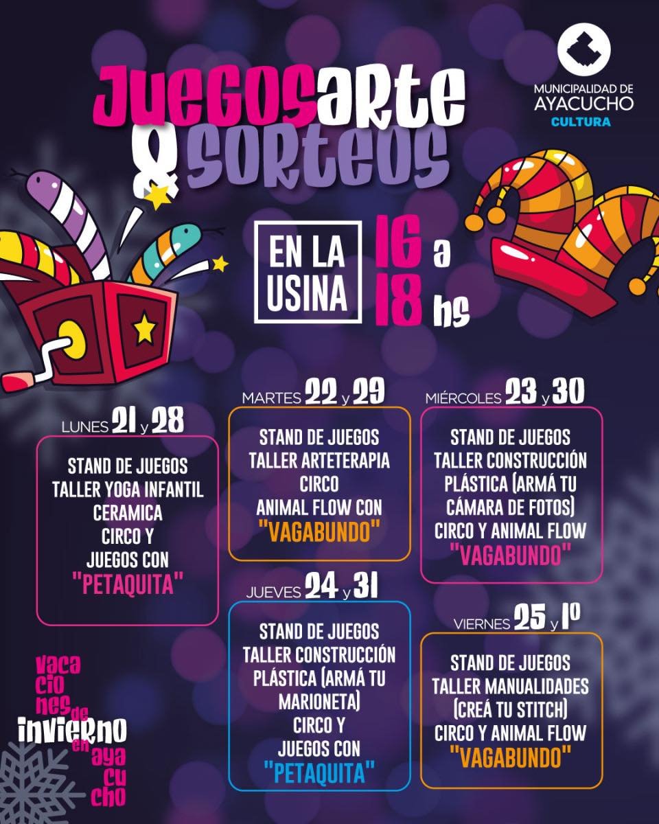 La Dirección de Cultura de la Municipalidad de Ayacucho lanzó una completa agenda de actividades para estas vacaciones de invierno, con el objetivo de brindar opciones recreativas y gratuitas a familias, niñas, niños y jóvenes de la ciudad. Bajo el lema “Vacaciones de invierno en Ayacucho”, la Usina Cultural se convierte en el epicentro de juegos, arte, cine y espectáculos.