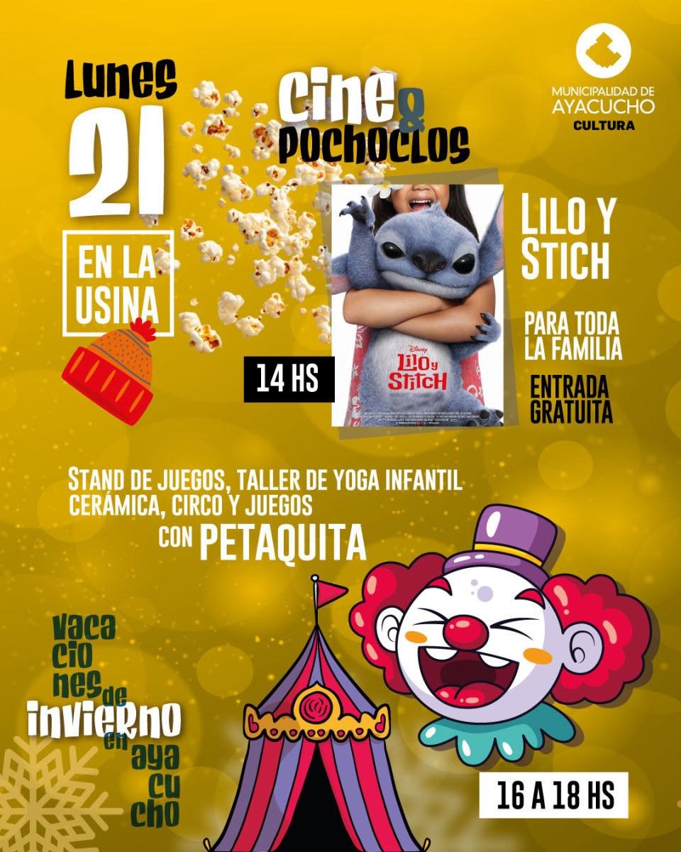 El lunes 21 se destaca la función de cine “Lilo y Stich”, programada a las 14 horas con entrada gratuita y pochoclos incluidos para todos los asistentes. Esta película familiar inaugura el ciclo “Cine & Pochoclos en La Usina”, pensado para disfrutar de clásicos animados y compartir un momento único entre vecinos y visitantes.